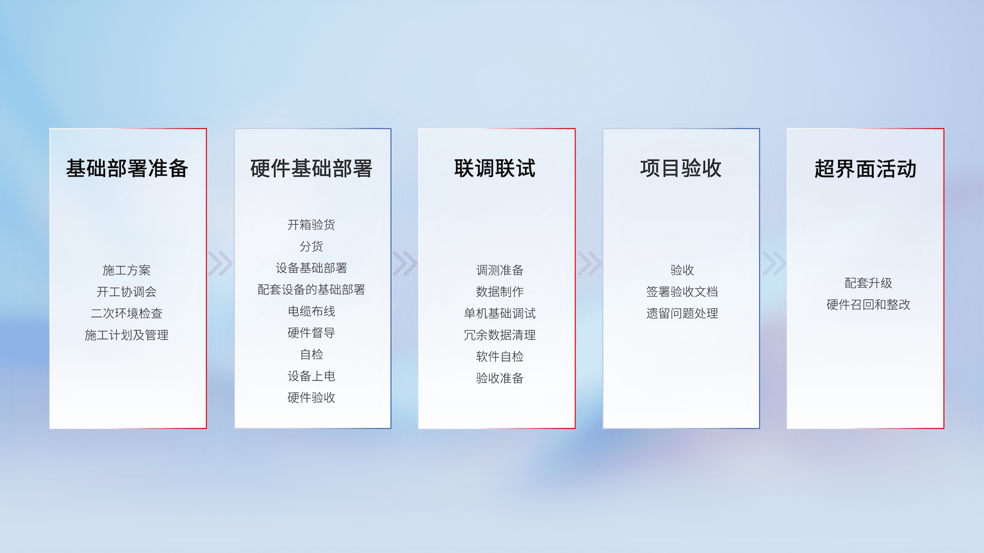 从基础部署准备、、、、硬件基础部署、、、、联调联试、、项目验收、、越界面活动的全过程可追溯,,,,保证施工质量和进度。。